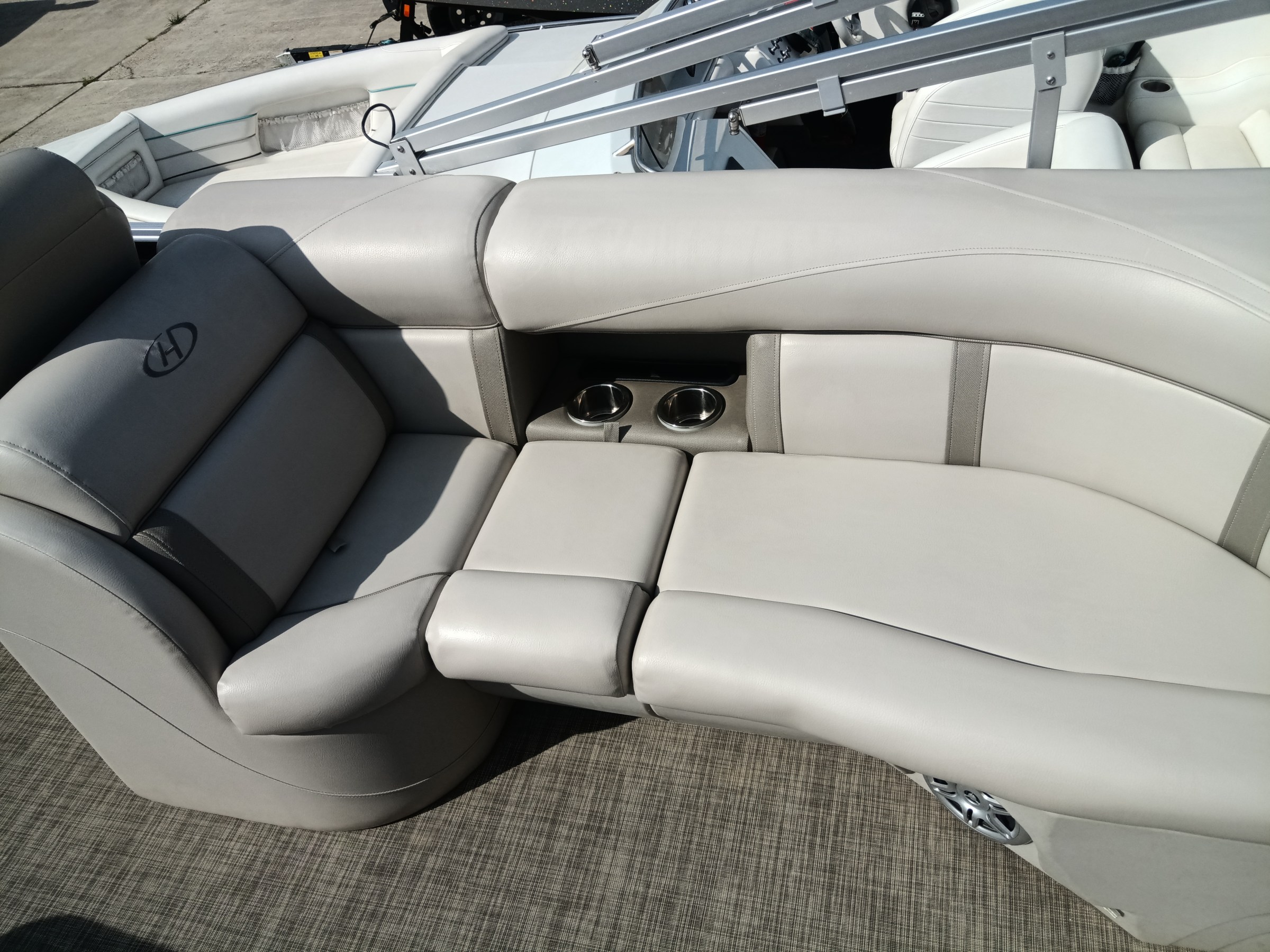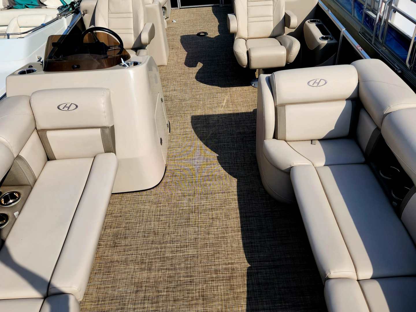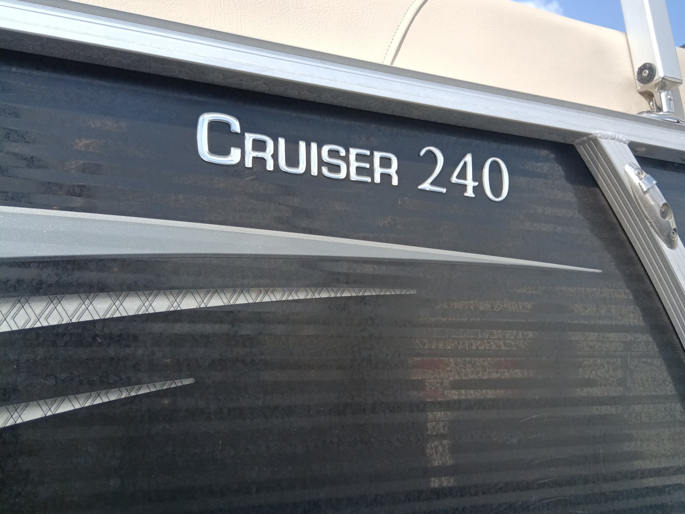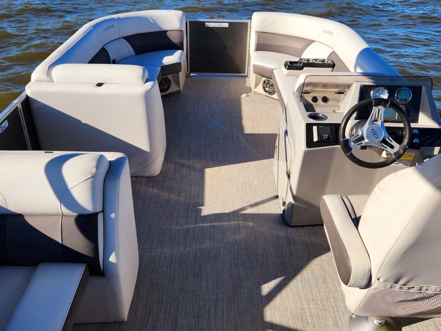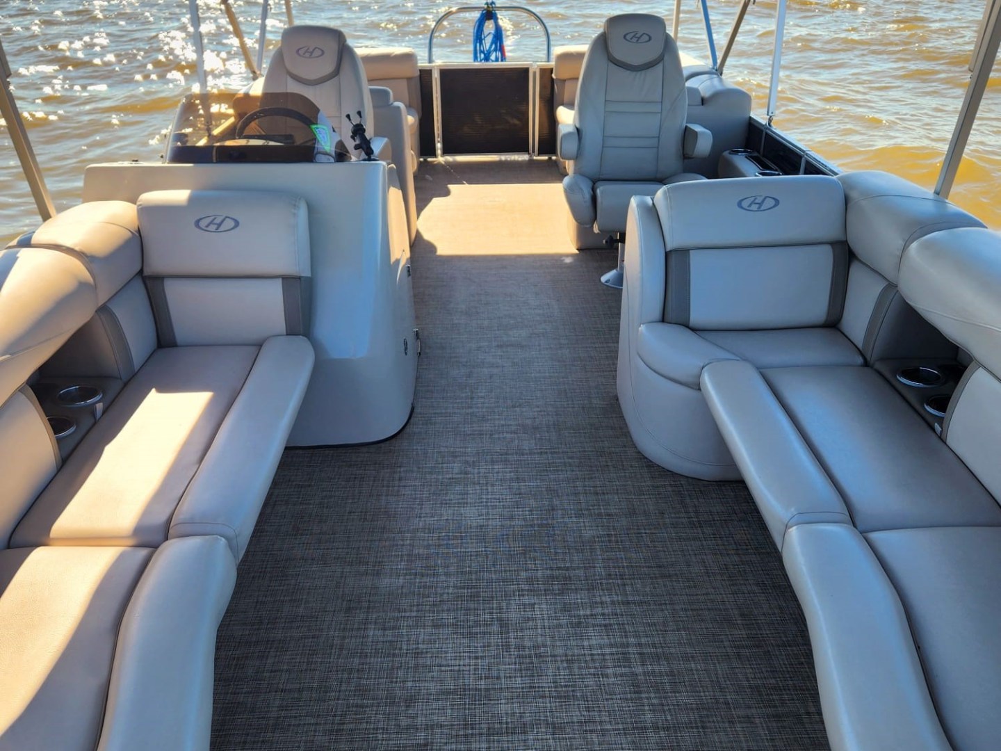 This Harris Cruiser 240 Tritoon has plenty of room for friends and family with its wide open layout from front to back. This boat has a double Bimini to keep the hot Texas sun away that can be collapsed to make it 1/2 Bimini or completely down to soak up the sun. It has a great Bluetooth radio for cruising and listening to music. This boat also has a live well for your fishing trip. Its equipped with a 150 HP Mercury that cruises about 29 MPH based on weight and lake conditions.