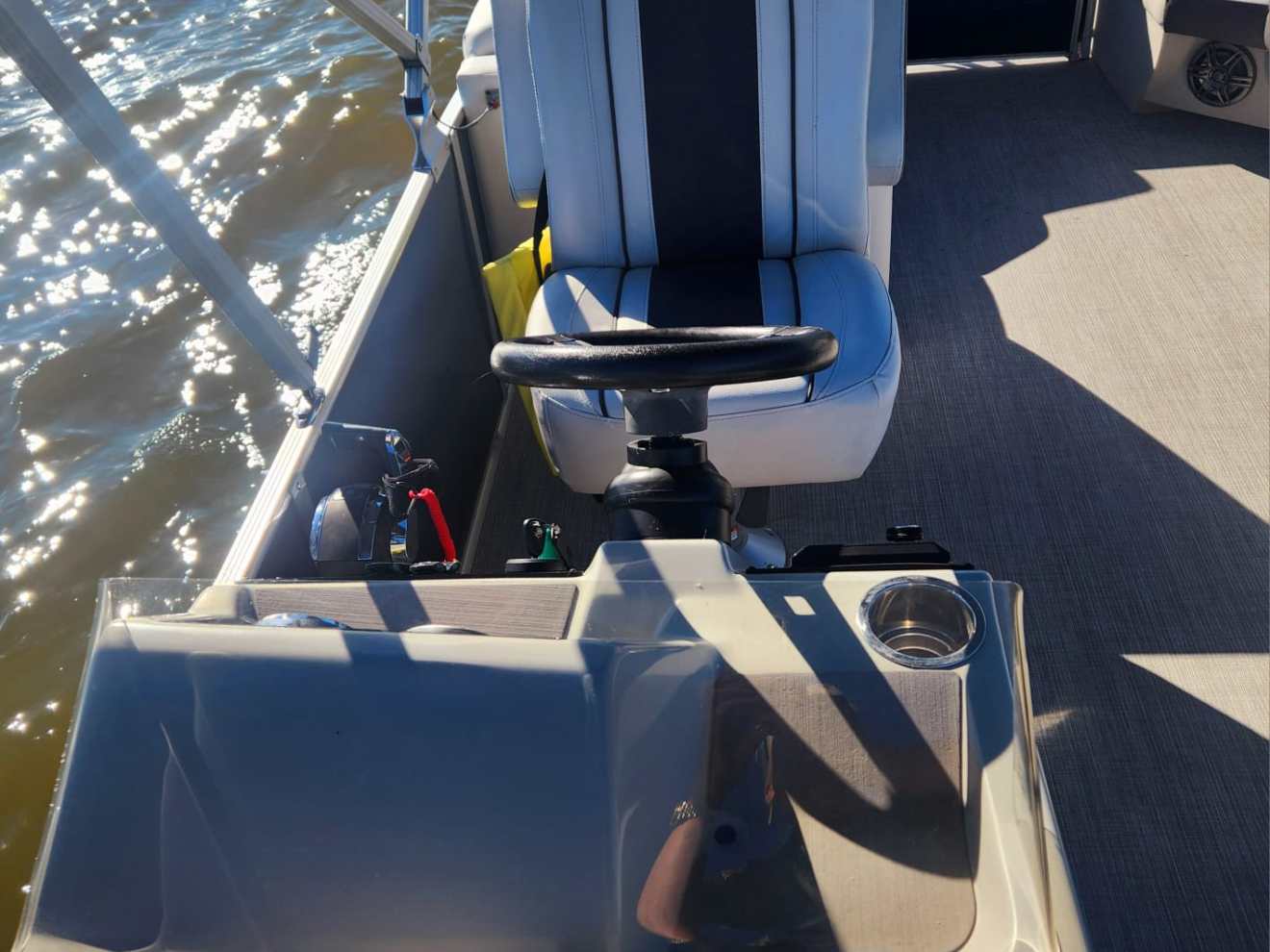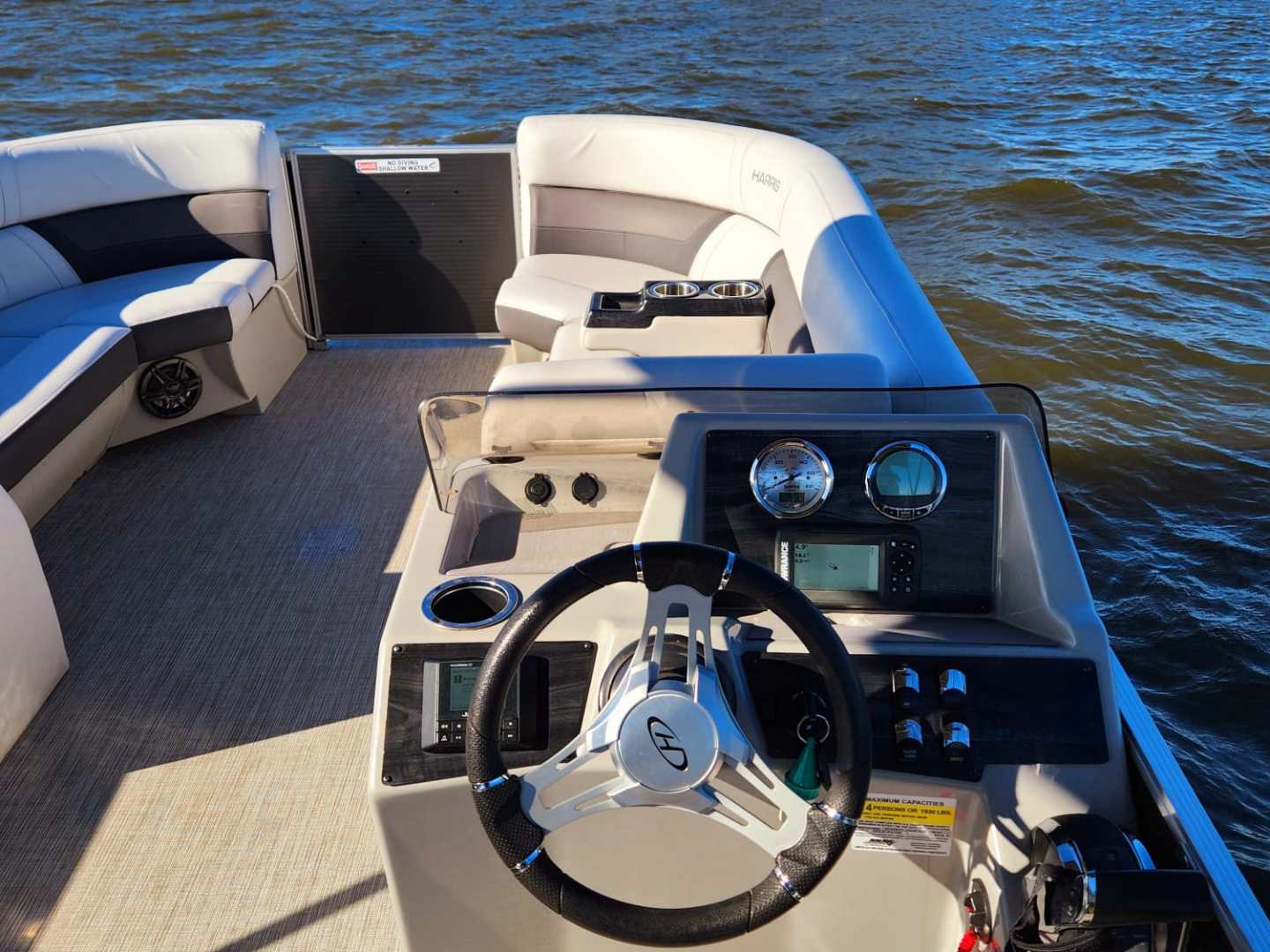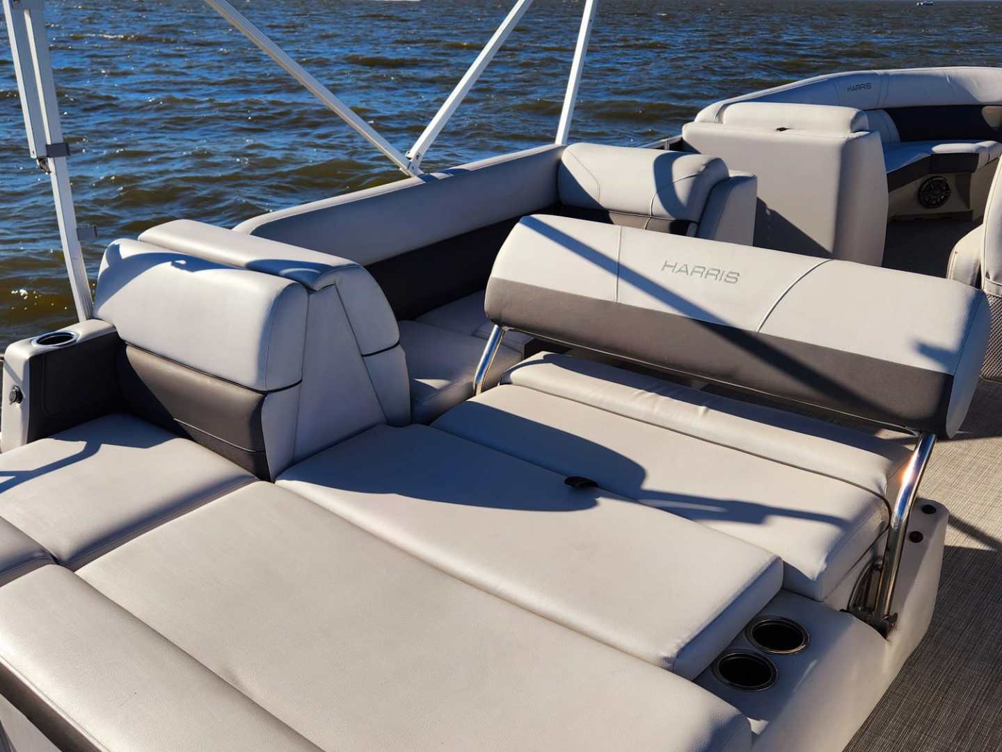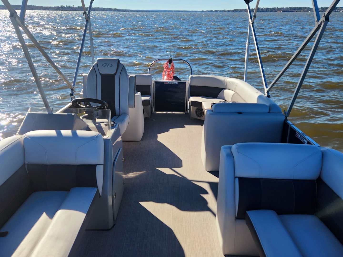 This Harris Cruiser 230 Tritoon has plenty of room for friends and family with its unique layout. This boat has a bench seat that converts to a rear facing seat or completely lie-flat. This boat has a Double Bimini to keep to keep you cool in the hot Texas sun and has a built in cooler to keep your drinks ice cold. It has a great Bluetooth radio for cruising and listening to music. Its equipped with a 175 HP Mercury that will definitely move across this lake with ease. It will cruise about 35MPH based on weight and lake conditions.