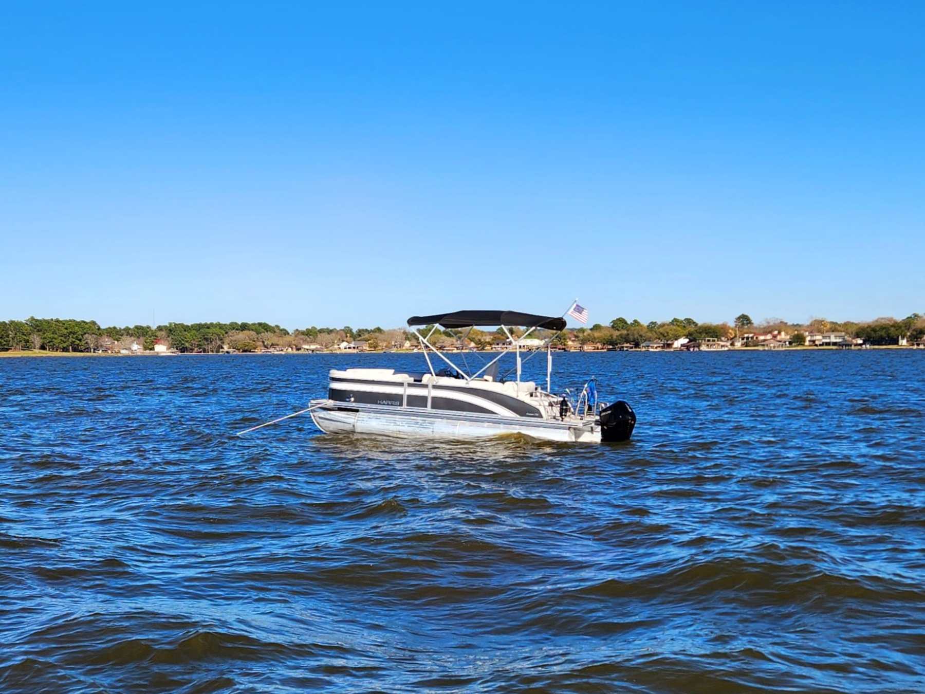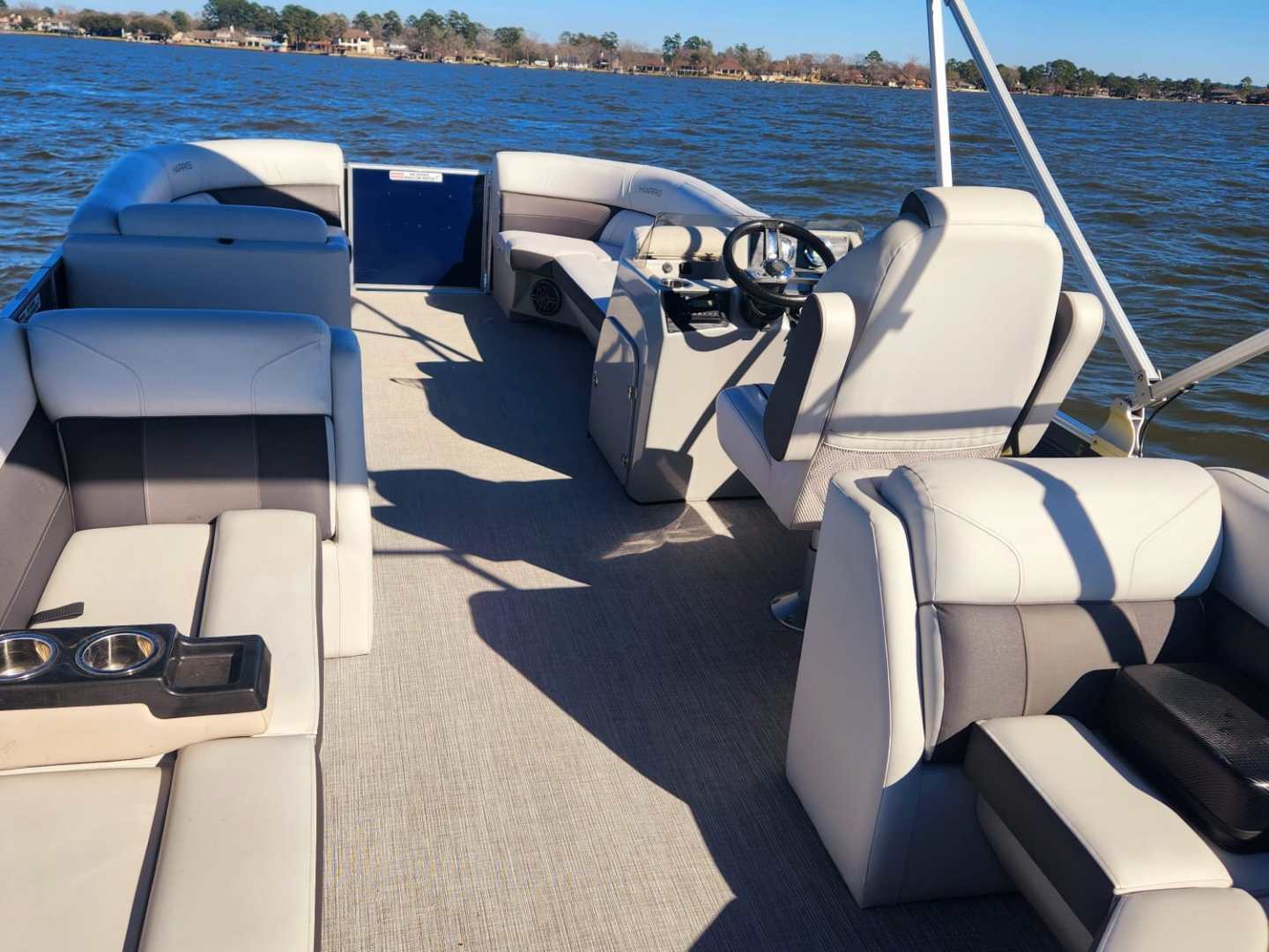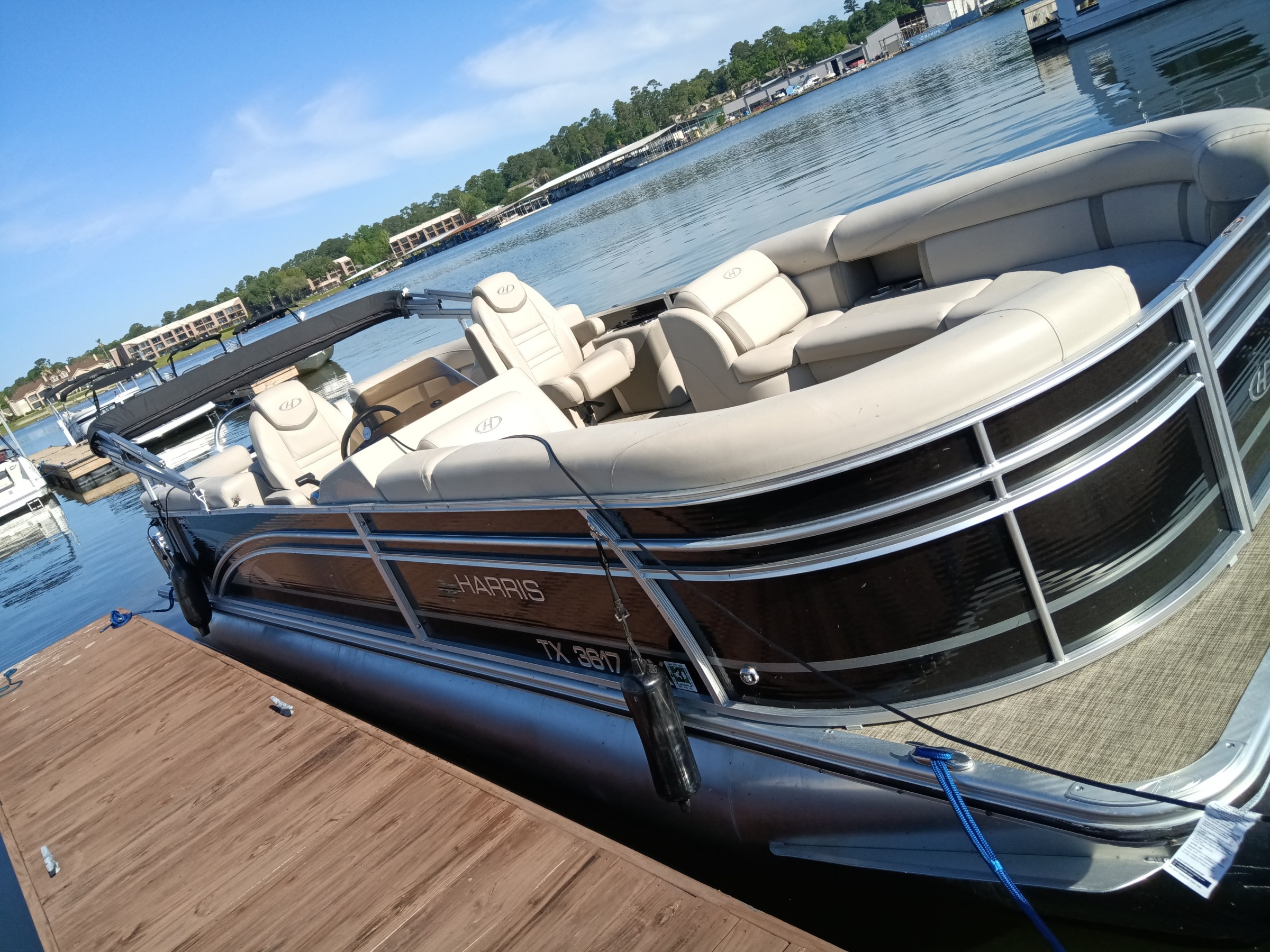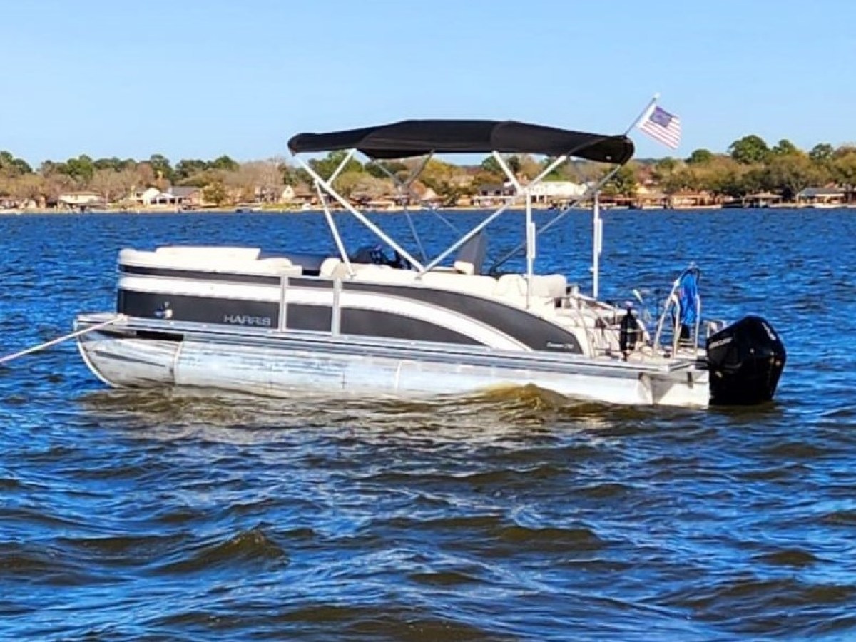 This Harris Cruiser 230 Tritoon has plenty of room for friends and family with its wide open layout from front to back. This boat has a Double Bimini to keep to keep you cool in the hot Texas sun. It has a great Bluetooth radio for cruising and listening to music. Its equipped with a 200 HP Mercury that will definitely move across this lake with ease. It will cruise about 38MPH based on weight and lake conditions.