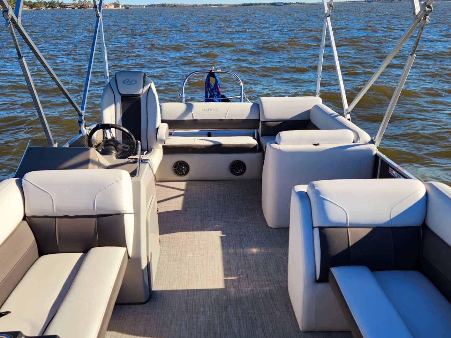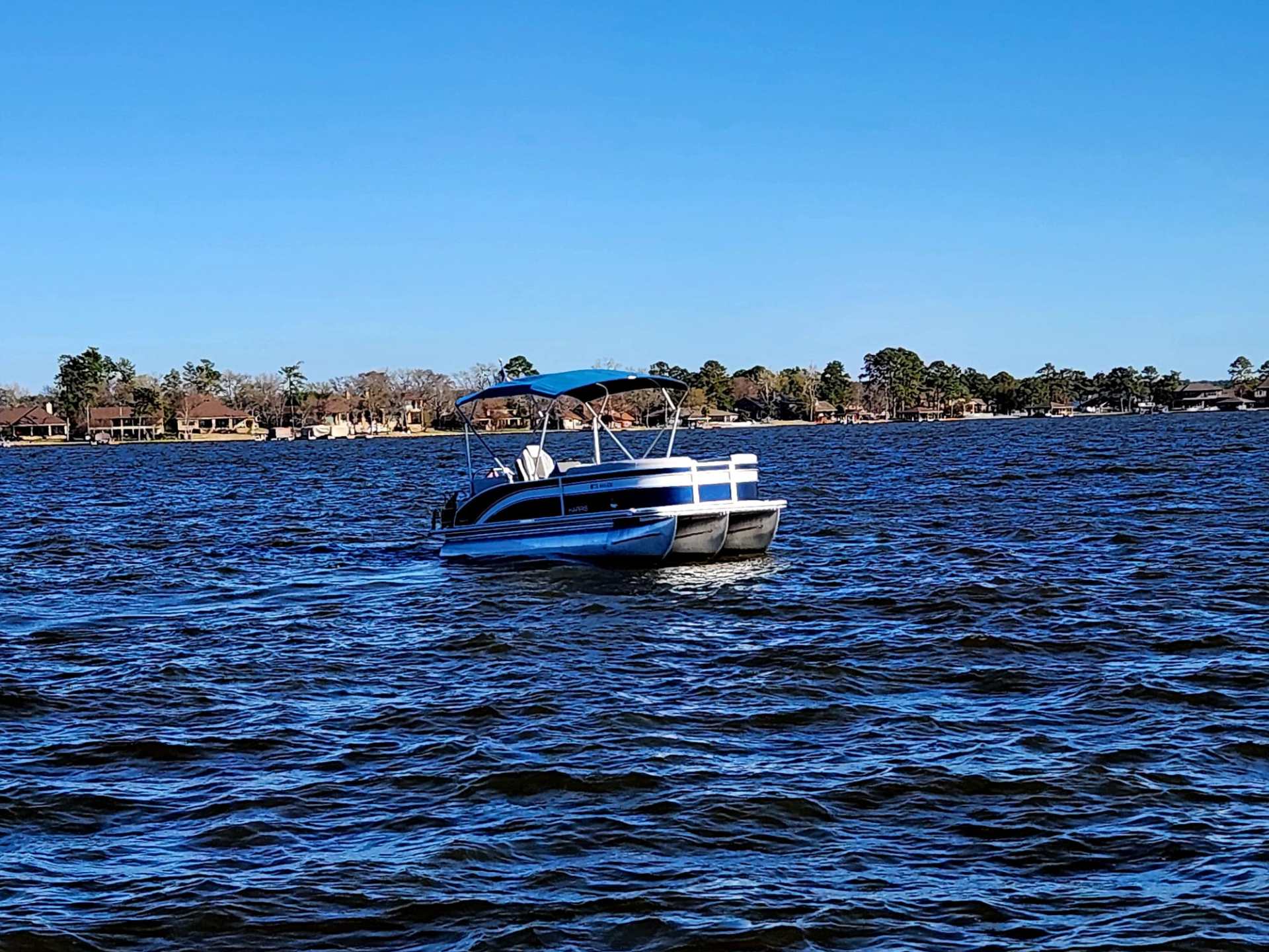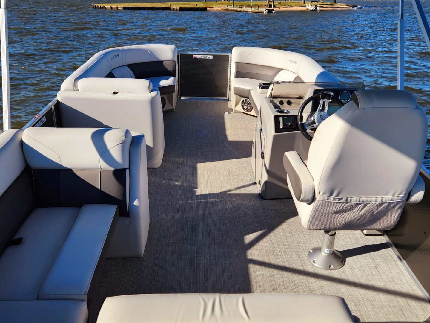 This Harris Cruiser 230 Tritoon has plenty of room for friends and family with its wide open layout from front to back. This boat has a Double Bimini to keep to keep you cool in the hot Texas sun. It has a great Bluetooth radio for cruising and listening to music. Its equipped with a 200 HP Mercury that will definitely move across this lake with ease. It will cruise about 38MPH based on weight and lake conditions.