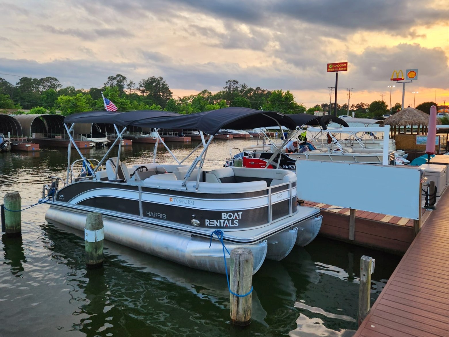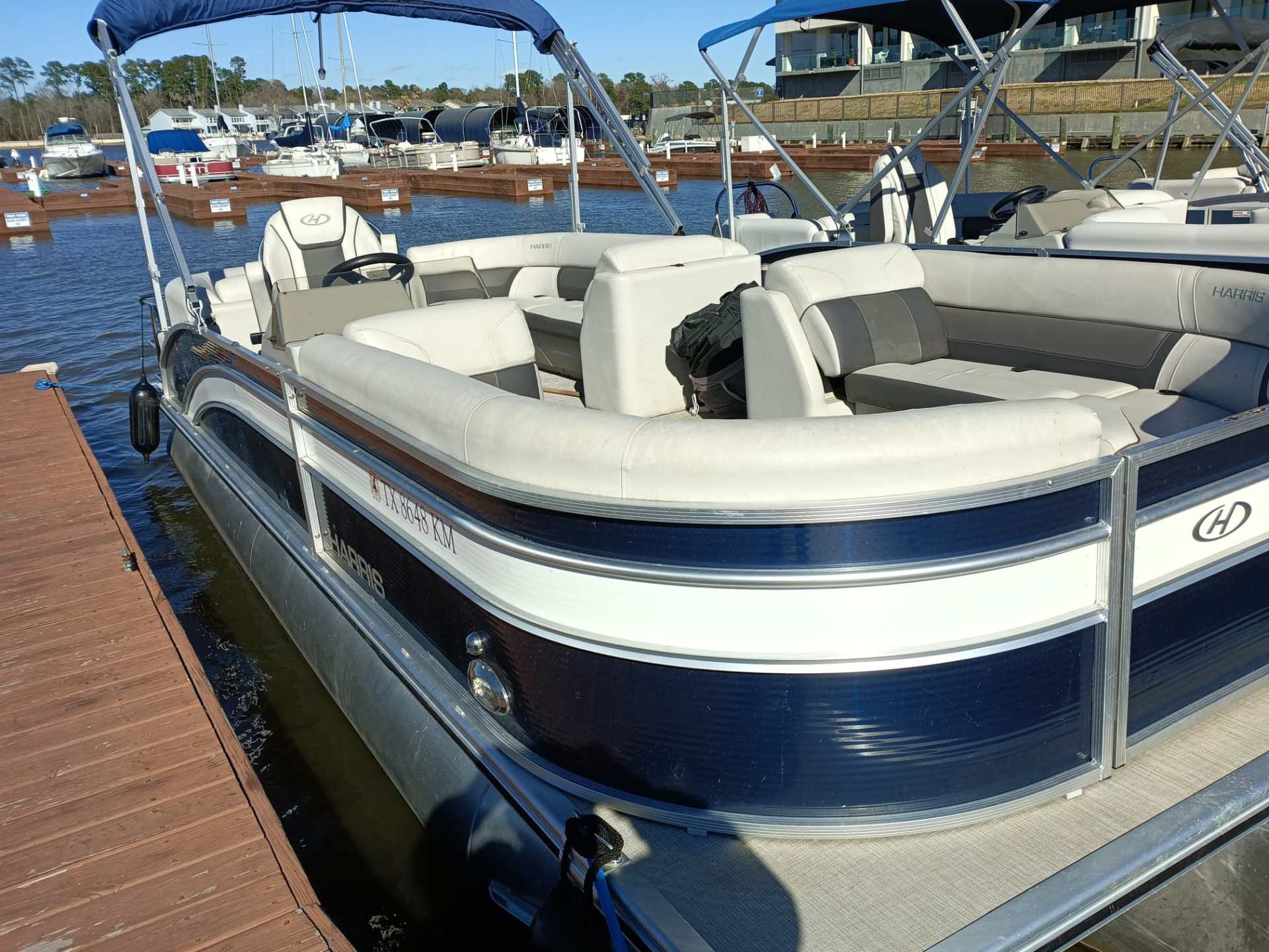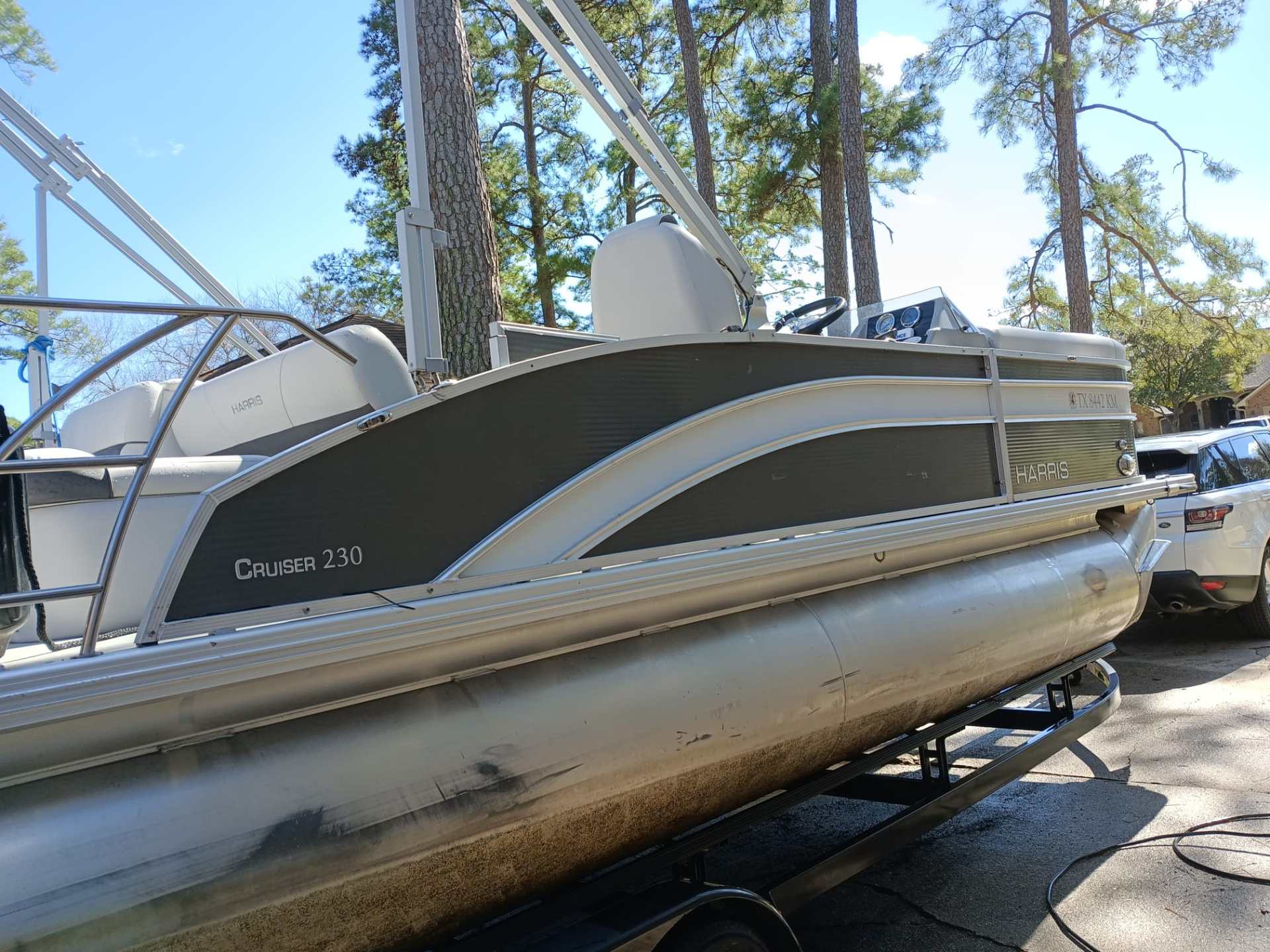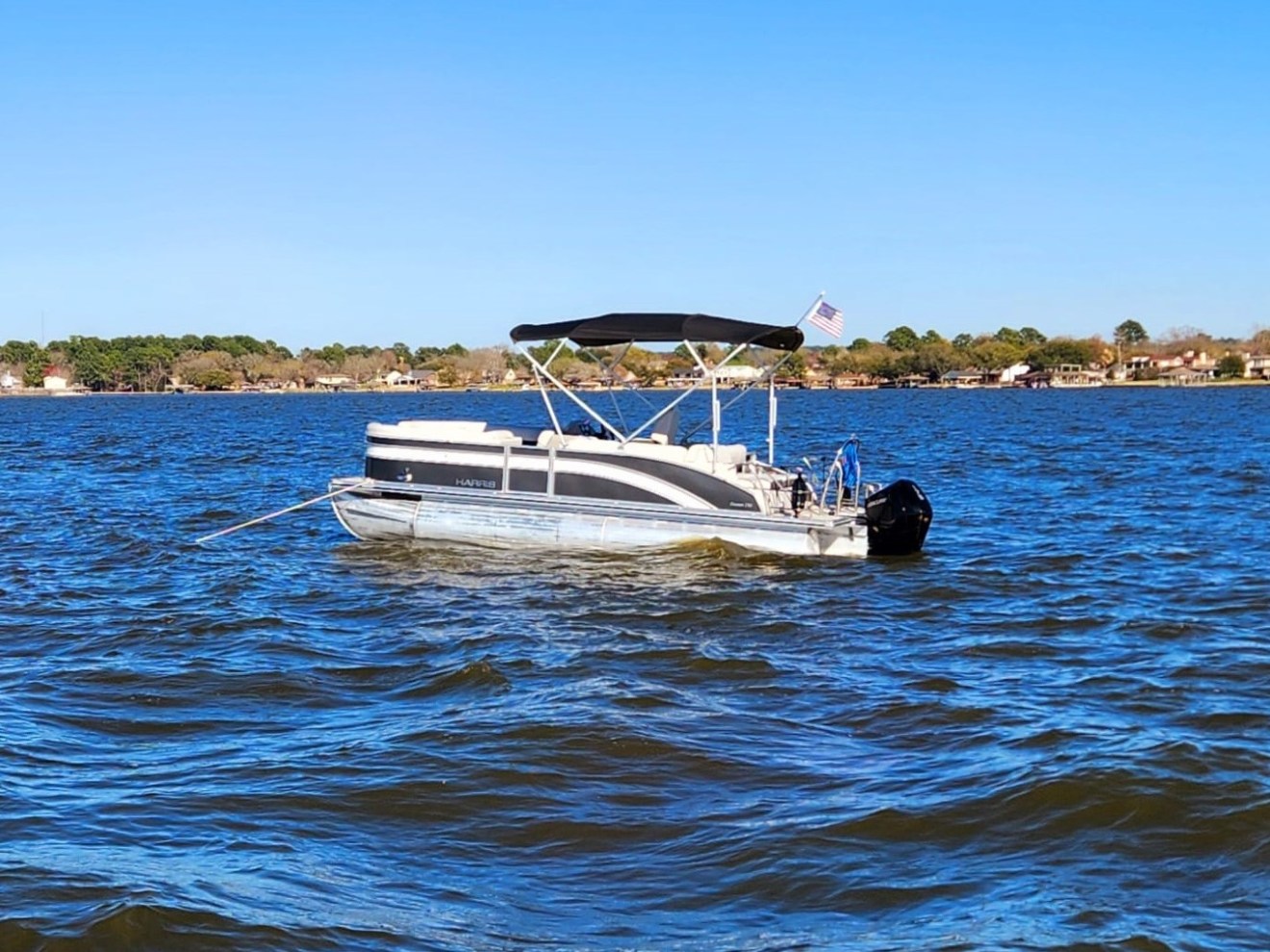 This Harris Cruiser 230 Tritoon has plenty of room for friends and family with its wide open layout from front to back. This boat has a Double Bimini to keep to keep you cool in the hot Texas sun. It has a great Bluetooth radio for cruising and listening to music. Its equipped with a 200 HP Mercury that will definitely move across this lake with ease. It will cruise about 38MPH based on weight and lake conditions.